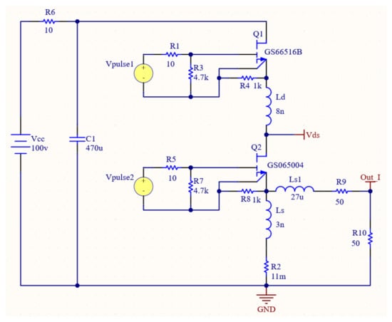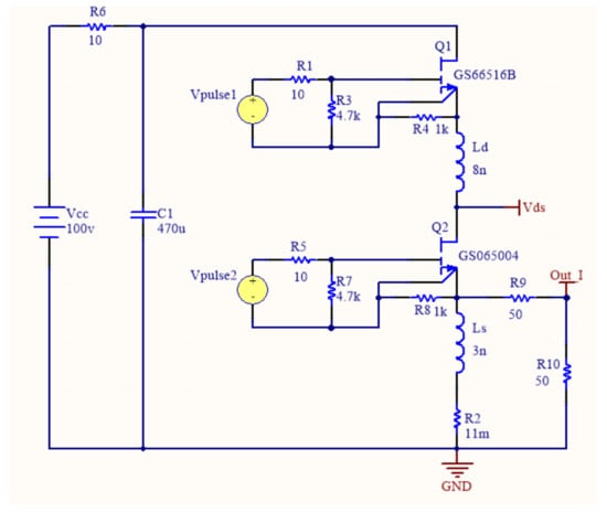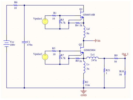 Figure 3 shows the simulated circuit to reproduces the pulsed tests. The circuit presents two devices in series each with their own driver circuit. The devices used are two 650 V enhancement-mode GaN transistors marketed by GaNSystem. Spice models supplied by the manufacturer were used for the simulations without taking thermal effects into account. Finally, the parallel of the shunt resistors used for measuring the current has been replaced by a single resistor with a series stray inductance of 3 nH. The two 50 Ω resistors account for the impedance matching between the test circuit and the oscilloscope.
