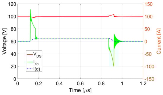 The circuit was used to simulate a 1-µs short circuit test. In Figure 4 the waveforms of the drain voltage and drain current obtained with VDS = 100 V and VGS = 6 V are reported. In blue we report the actual current, Id, circulating in the device. In green, the current Ish which would result from the measure of the voltage across the shunt resistor considering the attenuation factor is reported. As can be seen, due to the stray inductance of the resistors, the current Ish presents an overshoot lasting a hundred nanoseconds during which it reaches a value of almost an order of magnitude higher than the steady-state value.