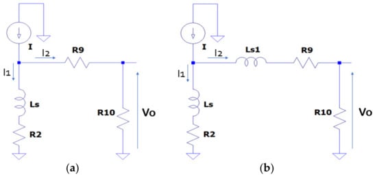 This result is easily justified if we look at the two circuits of Figure 6. In both cases, the upper part of the circuit of Figure 3 is schematised as a current generator that injects the drain current into the measurement circuit. In Figure 6a the case of the resistive shunt is considered including the effects of the parasitic inductance Ls. In the circuit of Figure 6b, we have inserted the compensation inductance Ls1.