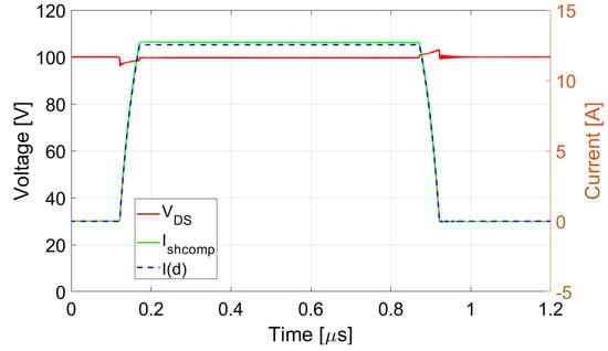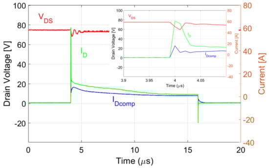 Finally, Figure 10 shows the VDS voltage and the current evaluated in the two cases. The ID current obtained by direct measurement of the voltage across the shunt resistors is shown in green. The initial value of the current is about 80 A and then starts to decrease to reach about 9 A after 15 µs. In blue we have the current measured using the proposed two-step compensation network. As can be seen, the measured current starts from at 17 A a considerably lower value than the previous one and then settles on 9 A.