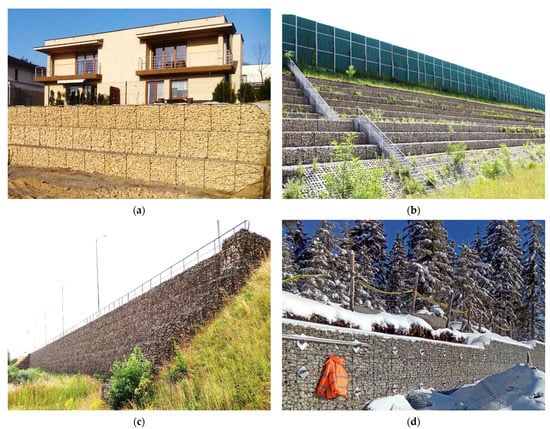 - Construction Report 2014: Gabion Retaining Structure, A4 Motorway Ruda Śląska, Poland; Maccaferri Company Poland: Warsaw, Poland, 2014; Available online: https://www.maccaferri.com/pl/produkty/gabiony-2/. (accessed on 1 September 2021). (In Polish)