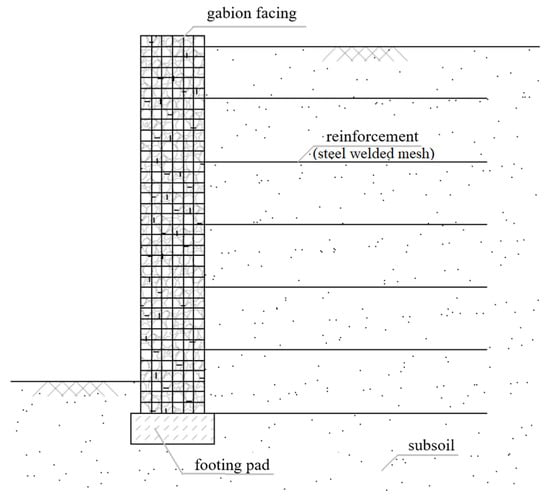- Woźniak, L. A Retaining Wall Made of Reinforced Soil in the Technology of a Gabion Wall Reinforced with a Steel Welded Mesh. M.Sc. Thesis, Silesian University of Technology, Gliwice, Poland, 2019. (In Polish). [Google Scholar]