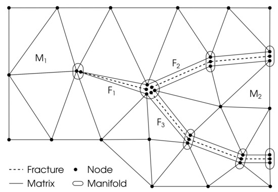 Triangular finite elements discretising two material patches M and M, and node–matched line elements representing three fractures F, F and F. Manifolds are constructed at multiplicated nodes. This also applies to lower-dimensional fracture manifolds.