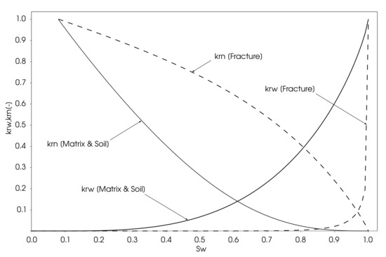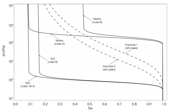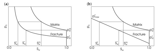 where, stands for the threshold saturation at which capillary pressure in the fracture reaches the entry pressure of the matrix, Figure 2. If the wetting-phase saturation in the fracture is below this threshold value, the capillary pressure in the fracture is higher than the entry pressure of the matrix, and the first condition of (8) is enforced so that capillary pressure is continuous across the interface. When the fracture saturation is higher than the threshold value and capillary pressure in the fracture is smaller than the entry pressure of the matrix, the non-wetting phase cannot leave the fracture. However, this capillary barrier does not stop the flow in the opposite direction. In this situation, capillary pressure is discontinuous across the interface. If matrix and fracture share the same entry pressure, capillary pressure is always continuous across the interface.