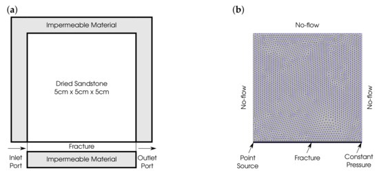 The rock sample was dried in a vacuum oven. Then, water was continuously injected through the injection port on the bottom left of the model at a constant flow rate of 0.1 cc/min. Excess fluid was collected from the production port in the model’s bottom right corner. To simulate the imbibition experiment, a mixed-dimensional triangular FE mesh was created (Figure 5b). Additional line elements along the bottom side of the block represent the fracture.