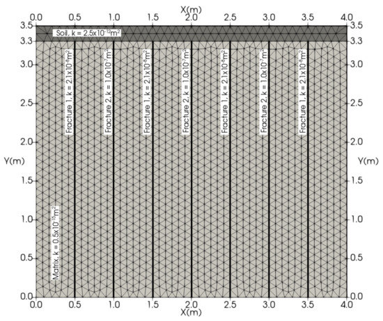 An idealised two-dimensional DFM model with vertical fractures intersecting a porous volcanic tuff with largely uniform micro-pores and a milli-Darcy permeability (cf., Dinçer and Bostancı [74]) serves as the second test case for the new DFM embedded-discontinuity solver (Figure 6, Table 2). A 20 cm thick layer of highly permeable and porous sandy soil covers this rock (0.4 m, = 0.28). The model dimensions are 4.0 × 3.5 m. The fractured tuff beneath the soil layer accounts for the largest portion of the pore volume of the model. Its permeability is 0.5 m and entry pressure p = 24.4 kPa.