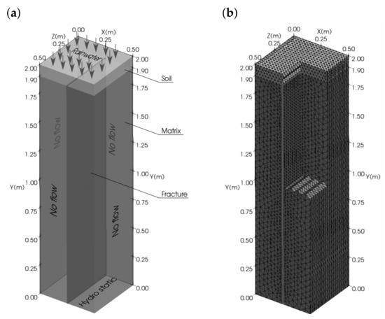 To study the effect of fracture aperture variations on the saturation front advancing in the fracture plane, a three-dimensional model was constructed (Figure 9a, Table 3). The dimensions of this model are 0.5 × 0.5 × 2 m. Similar to the previous cases, a cover layer of soil stays at the top model, and a fracture goes through a lower permeable rock layer. The finite element mesh divides the matrix into 249,750 tetra elements and the fracture surface into 17,258 triangle elements (Figure 9b).