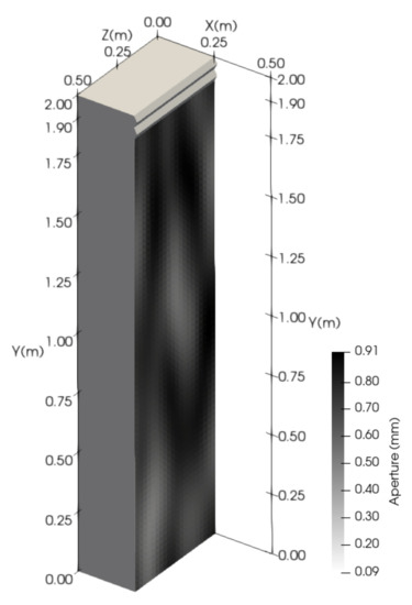 Fracture plane in model TUFF3D-VA with synthetically generated aperture variations between 0.09 and 0.91 mm plotted onto it.