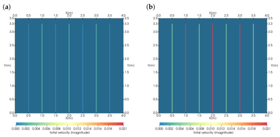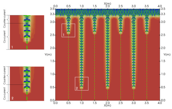 Parallel fractures penetrate the rock layer. Their hydraulic aperture alternates between 0.5 and 1.1 mm. The parallel-plate law determines fracture permeability: , results in permeability of m and m respectively, see Zimmerman and Bodvarsson [75]. A triangular mesh is used to discretise the domain with 3294 elements and 2002 nodes. The split operator introduces 231 new line elements representing the vertical fractures.