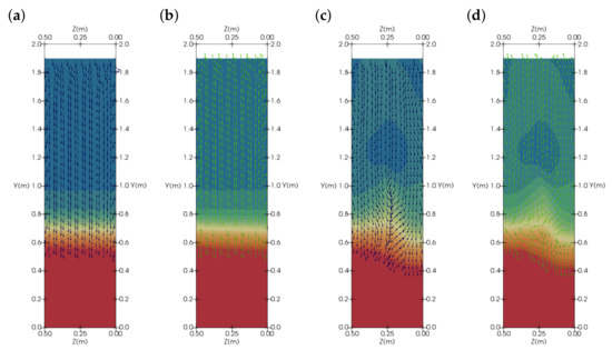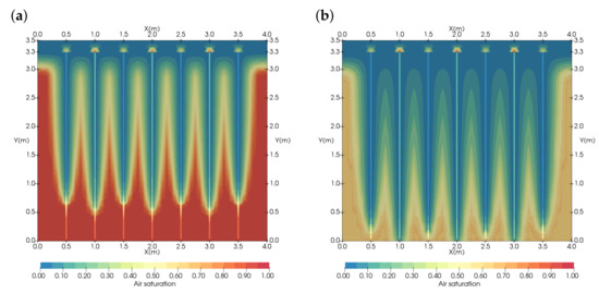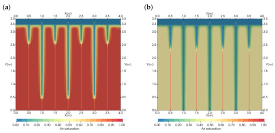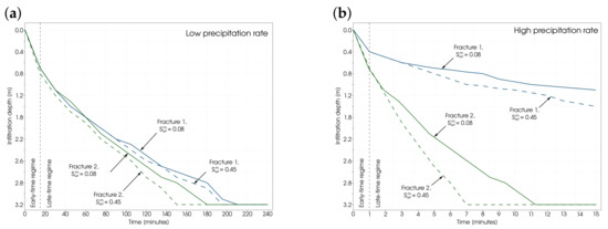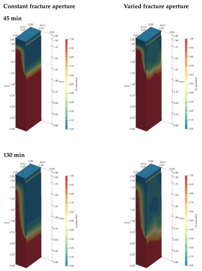 Aperture variations induce unique flow patterns within the fracture(s). If they are slight (<10% of the overall aperture), sheet flow remains prominent, in agreement with the conclusion of Cey et al. [82]. When they are larger, fingering destabilises the wetting front and water flow in the individual fingers is accelerated (Glass [29], Kawamoto and Miyazaki [83], Nicholl and Glass [84], Cueto-Felgueroso et al. [85]).