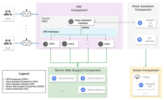 - A voice assistant interface (VAI): this is an abstraction of the embedded voice assistant tool being used. It includes the software elements to receive the audio, analyze it, send it to the voice assistant cloud, and retrieve the answer. If an HRIC has been invoked (using a particular voice command), then a string is sent to the next element without forwarding the voice command to the voice assistant (i.e., the framework responsible for the control of HRICs takes over and internally handles the commands without forwarding to the voice assistant).