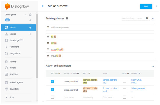 ACs are built with Actions on Google (https://developers.google.com/actions/ (accessed on 30 June 2021)) and were used to develop one application called Mr. Chess, which allows a user to play chess with voice commands. Actions On Google work in collaboration with Dialogflow, a user-friendly tool that allows the use of machine learning to understand the natural language of users.