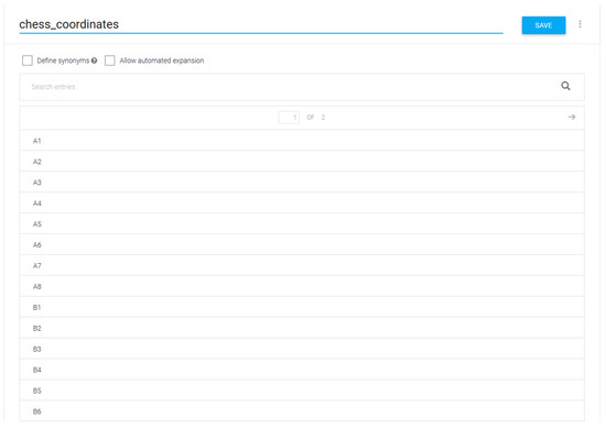 A new entity type, named chess_coordinates, was created. It specifies all the possible chess moves that can be found in users’ utterances. An example of its definition is shown in Figure 3.