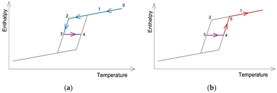 When the cooling phase of the completely melted material has begun (curve 0–1–2, Figure 5a) and before the phase change starts (point 2), the heat is released in a sensible way. After the phase change process has started, the energy is released in both latent and sensible ways (curve 2–3). At this point (point 3), the heating of the material begins again. Thus far, the enthalpy value follows the cooling curve state. The re-start of heating results in the termination of the cooling curve state and the start of the transition curve state (curve 3–4). For the transition curve, the enthalpy value is determined from either the heating curve or the cooling curve. At point 4, the process of melting of the partially solidified material restarts. At this moment, the transition curve state ends and the heating curve state will restart (curve 4–5 in Figure 5b). After the completion of the phase change, the material again accumulates heat only in a sensible way (curve 5–1) while remaining in the heating curve state.