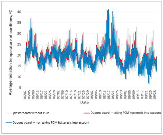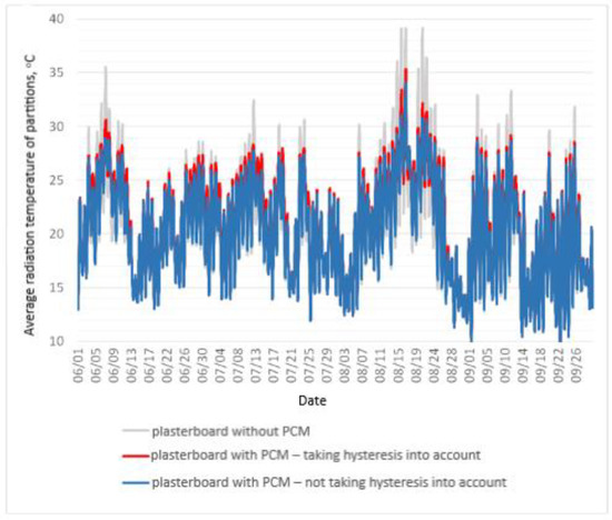 Figure 6 and Figure 7 show the values of the average radiation temperature of the internal surfaces of partitions in the period from 1 July to 30 September for the model with the phase-change material contained in the plasterboard and the Dupont board respectively. In both graphs, there is a noticeable tendency for the occurrence of lower values of the average radiation temperature of the partitions for models in which hysteresis has not been taken into account. The results of the calculations according to this algorithm could, therefore, be treated as more favorable in terms of reducing the risk of overheating of the building analyzed.