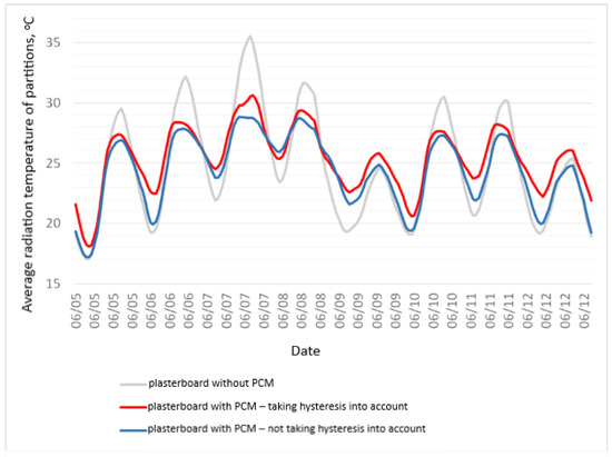 The following figures show the graphs of the average hourly radiation temperature of partitions during the selected week of June for the variants of a building with plasterboards (Figure 8) as well as Dupont board (Figure 9). Here, one can notice much clearer than before the strong influence of the phase-change material on the conditions inside and a large discrepancy in the course of the curves obtained on the basis of the standard algorithm compared to the algorithm modified with hysteresis. Temporary differences resulting from the use of PCM are from −0.98 °C to 3.49 °C for the variant using a plasterboard with PCM and from −0.88 K to 2.51 K for the variant with a Dupont board.