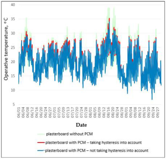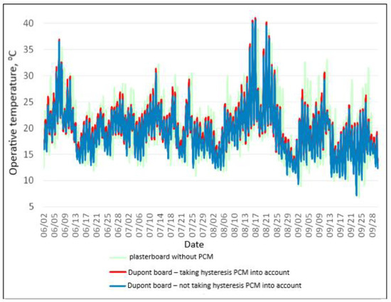 In the computer simulations of the object with the phase-change material, organic materials were used, characterized by a relatively low hysteresis of the material, compared to, e.g., inorganic materials. However, the effects of not taking into account even this relatively small hysteresis in the calculations are significant and can lead to significant errors in the calculation (differences in surface temperature values in individual time steps can reach up to 3.49 °C for PCM plasterboards and 2.51 °C for Dupont boards). In the analyzed examples, after taking into account hysteresis in the calculations, the period of surface temperature below the phase change temperature of the materials decreased by 212 and 341 h in the period from 1.06 to 30.09, for the options with PCM boards and Dupont boards, respectively. The average surface temperature for the entire analyzed period increased by 0.62 °C for PCM boards and by 0.49 °C for Dupont boards. Disregarding the hysteresis effect and adopting the same curves of Temperature Dependence of Enthalpy both during the heating and cooling process resulted in generating more favorable results in terms of reducing the risk of overheating of the interior of the analyzed building. Taking hysteresis into account, the period with an operating temperature higher than 25 °C increased by 82 h (19%) for the variant with PCM boards and by 60 h (22.22%) for the variant with Dupont boards. Therefore, neglecting hysteresis in the calculations may lead to overly optimistic forecasts regarding the effectiveness of phase-change materials inside buildings.