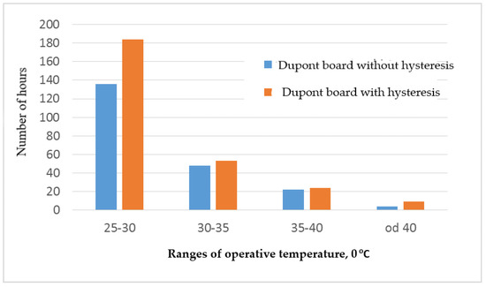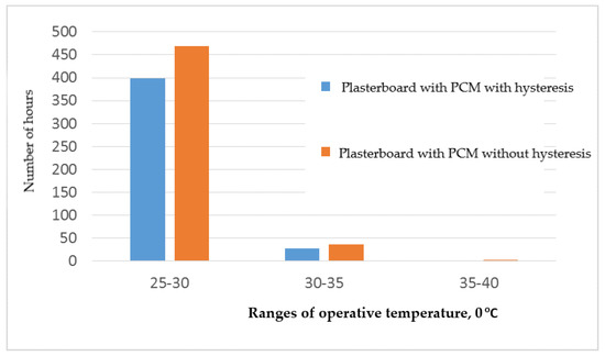 The graphs in Figure 12 and Figure 13 show a comparison of the time of occurrence of individual ranges of operating temperature. Figure 12 is for the Dupont variant and Figure 13 for the PCM plasterboard. The calculation results according to the hysteresis algorithm indicate a higher risk of overheating the building in both material variants. The operating temperature exceeding 25 °C in the case of plasterboards with PCM occurs for a longer period of 82 h, while for Dupont boards, it is longer by 60 h compared to the variant without hysteresis (this corresponds to over 19% and 22.22% of the total time, respectively, with a temperature above 25 °C). At the same time, if hysteresis is taken into account, higher maximum temperatures are obtained. This is due to the previously described consequence of neglecting hysteresis, i.e., underestimating the surface temperature of the materials. According to the calculations, in this case, the material has the ability to release previously stored energy more often. This is of key importance for the possibility of accumulating excessive heat gains in subsequent cycles and, thus, for the proper selection of PCM.