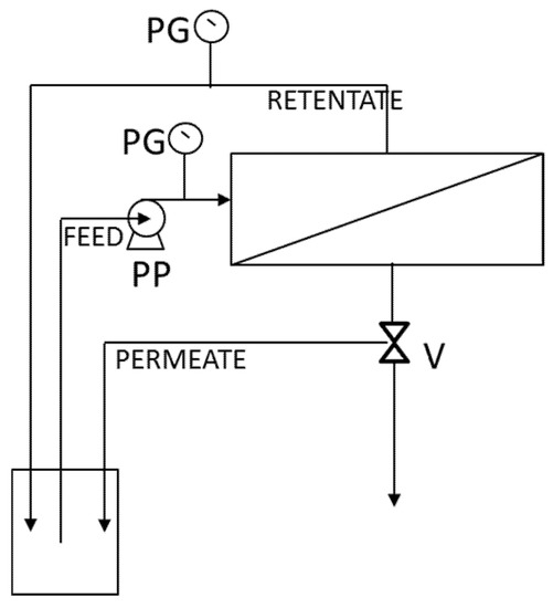 Schematic representation of cross-flow ultrafiltration system used. PG: pressure gauges, PP: peristaltic pump, V: valve. The same system was used to work in recycle mode (recirculating the permeate) and in concentration mode.
