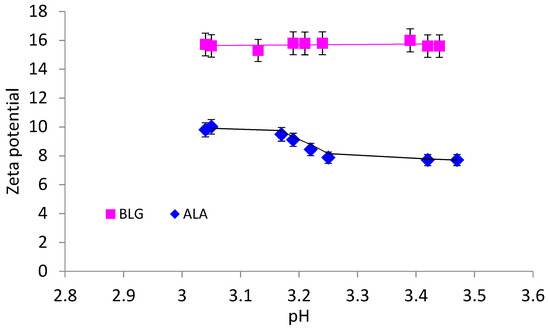 Zeta potential measurement of pure BLG and ALA solutions within pH range 3.0–3.5: ionic strength 0.1 M.
