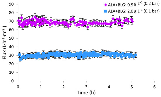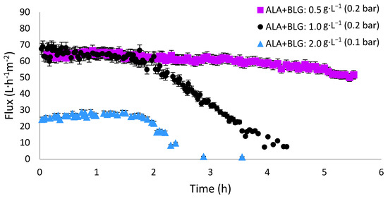 In Figure 5, the fluxes obtained during the ultrafiltration of binary protein mixture (0.5, 1.0, 2.0 g·L−1) at pH 3.4 are reported. When the initial protein concentration was 0.5 g·L−1, a constant flux was observed for about three hours (65 L·h·m−2); after that, the flux starts to decrease, reaching a value of 50 L·h·m−2 after 5 h of continuous UF process in concentration mode. However, after washing the membrane with the buffer, the initial pure water permeance (6.70 × 10−8 (±1.68 × 10−9) m·Pa−1·s−1) was restored (6.68 × 10−8 (±1.60 × 10−9) m·Pa−1·s−1), demonstrating that in this case also, no irreversible fouling did occur. If the initial protein concentration was doubled to 1 g·L−1, a constant flux was observed (Figure 5) (64 L·h−1·m−2) for about two hours; after that it started to decrease, reaching a value of about 10 L·h−1·m−2 after 4.3 h of UF process. If the initial protein mixture concentration was further increased to 2 g·L−1, a constant flux was observed for about 1.8 h; after that, a severe flux decrease was observed (Figure 5).
