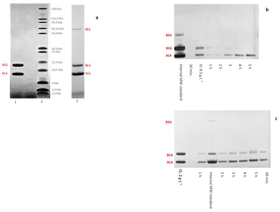Although a flux decrease was observed for both the highest concentrations used, the initial pure water permeance, also in this case, was completely recovered. The absence of irreversible fouling can be attributed to proteins and membrane electrostatic repulsion which avoids a possible chemical interaction between membrane and protein. The flux decrease was mainly due to reversible fouling, caused by the accumulation of the most retained protein on the retentate side of the membrane. In Figure 6, the electrophoretic profile related to permeates collected as a function of time for all the three initial protein concentrations tested is reported. When 0.5 g·L−1 was used (Figure 6a), just ALA can pass through the membrane, increasing its concentration as a function of time. Until a VRF of about 1.5, 95% of pure ALA was obtained with a recovery factor of 33% (Table 3).