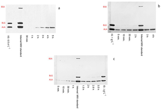 SDS-PAGE carried on permeates collected as a function of time when the UF process was carried out at pH 3.4. IS: initial solution concentration. (a) IS: 0.5 g·L−1; (b) IS: 1 g·L−1; (c) IS: 2 g·L−1 (IS and samples dilution: 1:2).