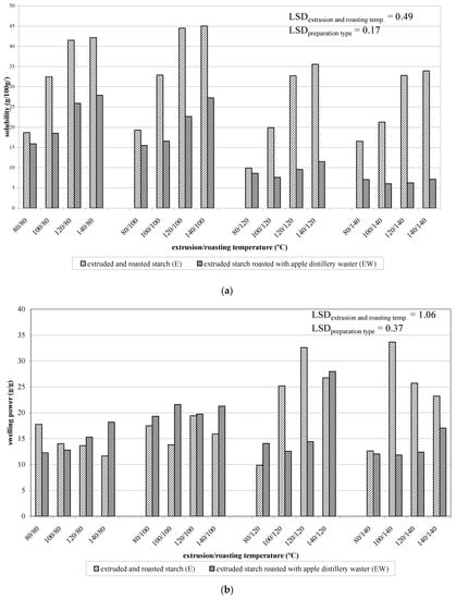 Solubility (a) and swelling power (b) of extruded and roasted starch (E) and of starch extruded with apple distiller wastewater and roasted (EW).