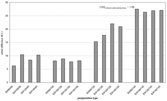 The color difference (darkening) ΔE of the starch extruded with apple distillery wastewater and roasted (EW) compared to the reference sample (E) increased with increasing roasting temperature, on average from about 9 to 27 (Figure 4). Such a significant color change may result from the caramelization reaction proceeding under these conditions [41] and the Maillard reaction [42].