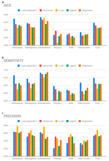 Bar chart results of (A) dice score; (B) sensitivity; and (C) precision of deep learning-based segmentation versus ground truth on different lesion types in the NTUH dataset.