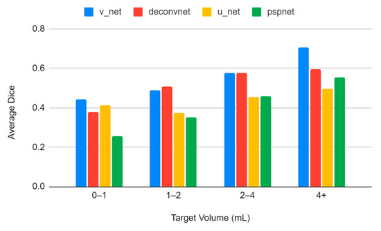 As shown in Figure 2, lesions with smaller target volumes introduce lower average dice performance for each deep-learning model. V-Net, the best-performing model in the current study, obtained a fairly satisfactory dice score when lesion size exceeded the median size of all targets.