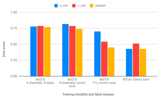 To compare the performances of different models trained with one-channel input on the segmentation of brain lesions, we performed another experiment in which models were trained with just T1+C input with tumor core labels of the BraTS dataset. The evaluation was based on prediction of the tumor cores. As shown in Figure 3, V-Net had the highest Dice score when trained with 4-channel input with 5-class labels. Interestingly, all models performed better in this circumstance than when trained with only T1+C images. Of note, V-Net and PSPNet could not yield comparable results when trained with only T1+C images, implying that they are more sensitive to the change from multimodal to single modality inputs. While the models trained with one-channel inputs yielded lower performances in segmentation, they still performed better than their counterparts trained with the NTUH dataset.