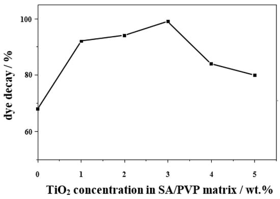 As the catalyst loading in the SA/PVP/TiO2 nanocomposite has a key role in dye decay efficiency, the effect of the photocatalyst concentration on MB degradation was investigated by increasing the TiO2 amount in the SA/PVP matrix from 1 to 5 wt.%. As seen in Figure 4, the decay efficiency rose when the TiO2 concentration increased from 1 to 3 wt.%, which can be justified by the fact that at low concentrations, more porous empty sites and polymer functional groups, such as COO, are accessible on the beads’ external surface to absorb cationic dye molecules via electrostatic attraction. However, the active sites available for the photocatalytic reaction are limited. Thus, by increasing the catalyst loading to 3 wt.%, additional active sites become available for the photocatalytic reaction. This leads to an increase in the hydroxyl ions’ adsorption onto the surface of the beads to produce OH• radicals. On the other hand, the photocatalytic activity decreased at a high concentration of the catalyst, as it hampers the dye decay rate as a result of light penetration shortage inside the beads. A second possibility is the agglomeration of the catalyst nanoparticles, resulting in a decrease in the operative surface area of the catalyst, and consequently, a decrease in the decolorization efficiency.