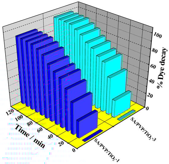 However, under visible light, as can be seen in Figure 5, the results reveal that the photocatalytic activity increased with the duration of the illumination period, with the SA/PVP/TiO2-1 and SA/PVP/TiO2-3 nanocomposite beads reaching 92% and 98.9% of MB dye decay, respectively, after 120 min of illumination.