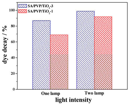 Effect of the light intensity on MB photocatalytic degradation using SA/PVP/TiO2 nanocomposite (pH 7; 120 min of illumination time; and 50 mg L−1 initial MB concentration).