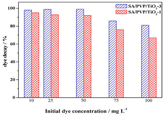 The effect of the initial dye concentration on the photocatalytic decay of MB is shown in Figure 7 for both SA/PVP/TiO2-1 and SA/PVP/TiO2-3 nanocomposite beads. In each experiment, the same quantity of nanocomposite beads (1 g L−1) was added to solutions containing different dye concentrations (10, 25, 50, and 100 mg L−1). The pH of the dye solution was kept at 7 and the contact time and light intensity were 120 min and 1200 lm, respectively. Figure 7 shows that dye decay tends to increase for higher initial MB concentration, the higher decay being attained at 50 mg L−1. Further increasing the MB dye concentration negatively affected its decay. This can be justified by the dependence of the photodegradation rate of the dyes on the formation of OH• radicals on the catalyst surface, followed by the reaction of such radicals with the MB dye molecules. The higher dye decay rate observed at lower initial dye concentrations can be related to a higher chance of the dye molecules to react with OH• [27,28]. The following steps describe the mechanism proposed for MB degradation via the nanocomposite beads. First, irradiation with visible light enables electrons in the valence band to move to the conduction band. The surface of the TiO2 photocatalyst then forms holes and electrons. Electrons react with dissolved O2 to produce O2•−, while holes react with OH− ions to produce OH•. The latter reacts with MB dye to degrade it into non-toxic products, such as CO2, and water. Additional OH• is produced in the reaction between H2O2 and e−, further enhancing MB dye degradation [29,30,31].