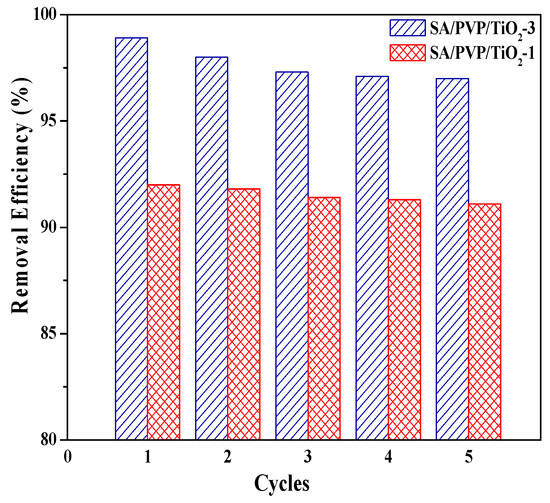 Five consecutive experimental runs were performed under optimal conditions using the same set of beads to evaluate the reusability of SA/PVP/TiO2 nanocomposites as indicated in Figure 8, which permits the process to be considered a cost-effective degradation process for MB. The SA/PVP/TiO2 nanocomposite beads were recovered and used five times by washing with 0.1 M HCl solution. The obtained data reveal that the MB decay efficiency remained practically unchanged as the cycle number increased. This result may be due to the stability of TiO2 nanotubes in the SA/PVP polymer matrix.