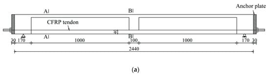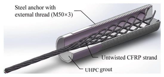 The conventional anchor used for steel strands was not suitable for FRP tendons, hence a bond-type anchor developed by our group was employed [28,29]. The previous investigation indicated that a bond length of no less than 36de (approximately 150 mm) in UHPC grout could insure a satisfactory anchorage even under impact loading [28]. Thus, the bond length of CFCC® strands was conservatively adopted as 220 mm in the present study. An external tendon-anchor assembly comprised a CFCC® strand and bond-type anchors grouted with plain UHPC free of steel fibers at each end. To increase the effective contact area with the filling grout for better anchoring performance, the CFRP tendons was untwisted inside the anchor tube, as shown in Figure 3.