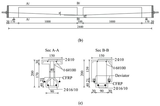 Dimensions and cross section of specimens (dimensions in mm): (a) layout of specimens with horizontal tendons; (b) layout of specimens with deviated tendons; (c) details of section A-A and B-B for partially prestressed beams.