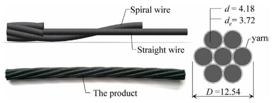 The Carbon Fiber Composite Cable (CFCC®) manufactured by Tokyo Rope, Japan was used for the external tendons in the tested beams. This type of CFRP strand, with the nominal diameter D of 12.54 mm, consists of one straight wire and six twisted wires. The individual wires were fabricated through a roving prepreg process, then twisted and wrapped with a synthetic protective yarn. The nominal diameter d and the effective diameter de of each wire were 4.18 mm and 3.72 mm, respectively, as shown in Figure 2. The mechanical properties of CFRP tendons as well as steel reinforcements were included in Table 2.