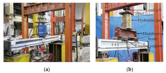 View of test setup: (a) three-point loading; (b) four-point loading.