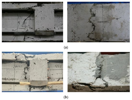 Typical failure patterns of specimens: (a) tension controlled failure of the fully prestressed specimen; (b) compression controlled failure of the partially prestressed specimen.