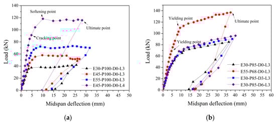 - The second stage was from the flexural cracking point to the softening point. Because the crack surfaces were bridged by closely spaced steel fibers, the flexural cracks propagated sightly during this stage. However, the steel fibers at the crack region gradually exhausted their crack-bridging effect with the increasing load, and thus the softening load was obtained when the strain in the most extreme fiber in tension reached the ultimate tensile strain of UHPC (approximately 7000 με [12]). Compared with the corresponding cracking loads, the softening loads of the fully prestressed specimens increased by 5.3% (E30-P100-D0-L3) to 29.6% (E45-P100-D0-L4). This could be attributed to the crack-bridging effect of steel fibers in the tension zone.