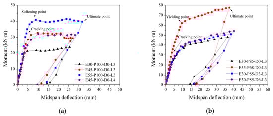 Moment–deflection relationships of specimens: (a) the fully prestressed specimens; (b) the partially prestressed specimens.