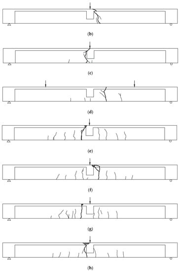 Cracking patterns of specimens: (a) E30-P100-D0-L3; (b) E45-P100-D0-L3; (c) E55-P100-D0-L3; (d) E45-P100-D0-L4; (e) E30-P85-D0-L3; (f) E30-P85-D3-L3; (g) E30-P85-D6-L3; (h) E55-P68-D0-L3.