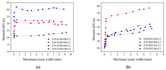 Moment–maximum crack width relationships of beams: (a) fully prestressed specimens; (b) partially prestressed beams.