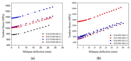 Moreover, as an externally prestressed beam is deflected with increasing applied load, the eccentricity of the tendons between the anchorages or deviators with respect to the neutral axis of the section gradually reduced due to its lack of restraint to the beam, which is defined as the second-order effect of external tenons [24]. Compared to that of E30-P85-D0-L3, ultimate stress increments of E30-P85-D3-L3 and E30-P85-D6-L3 increased by 5.4% and 14.3%, respectively. This is because compared to that of the straight tendons with a same fpe, the deviated external tendons induced a smaller inverted camber of the specimen [32], and avoided the CFRP tendon detaching the deviator before the cracking state, which would benefit to the simultaneous work of tendons and beam. However, the free length of tendons (length between anchorage and deviator) was insignificant. Owing to the employment of the saddle-shaped deviator in the midspan, the influence of the second-order effects on the flexural behavior of externally prestressed members greatly minimized, even for the horizontal tendons. Thus, the differences in ultimate tendon stress were relatively small.