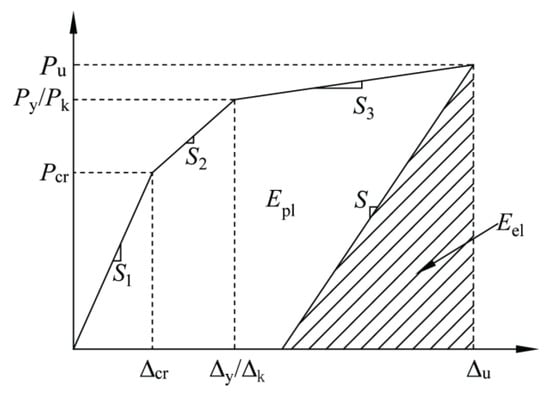 Because of the linear elastic behavior of FRP tendons, the conventional ductility index based on steel-reinforced structures was not suitable for FRP-reinforced structures. Therefore, the Naaman deformability index μ can be expressed by Equation (1) [33]. In this energy-based method, the deformability represented the energy absorption ability, as shown in Figure 11.
