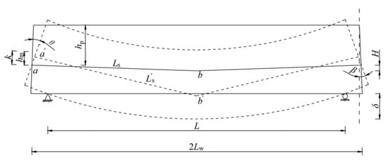 where Ls is the initial length of the external tendon between the anchorage and the deviator; ΔLs is the elongation of CFRP tendon; H is the vertical distance from the anchorage to the deviator; δ is the deflection in midspan; Lw is the horizontal distance from the anchorage to the deviator, and ; k is the actual distance from the anchorage to the centroid of cross section of the beam-end, which could be calculated using Equation (5); and θu is the ultimate rotation angle of the beam-end.