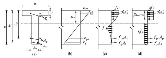Figure 14b,c represent the strain and stress distributions of T-shaped cross-sections at the ultimate state. Two equivalent rectangular stress blocks are applied to simplify the compression and tensile stress distribution, as shown in Figure 14d. α, β are defined as the equivalent coefficients of compression stress distribution, and κ is the equivalent coefficient of tension stress distribution. In particular, α is taken as 0.92, β is 0.74, and κ is 0.25 [27,42]. The yielding stress of steel bars under compression f’y could be reasonably adopted as the yielding stress under tension fy.